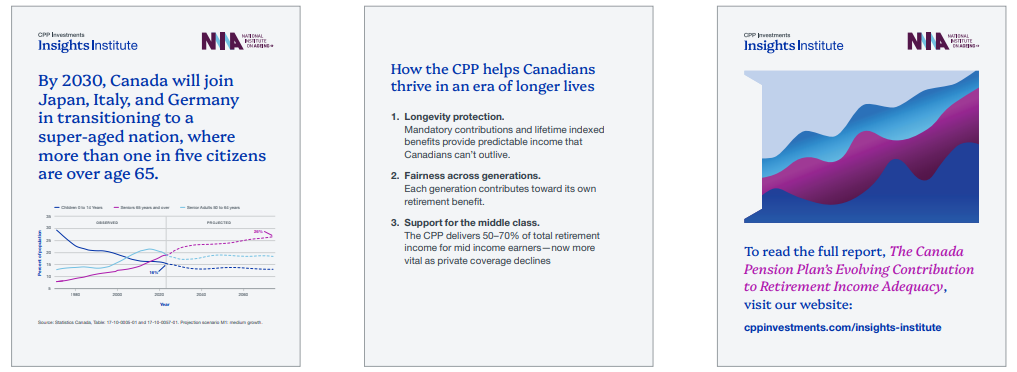 In a new joint report with the CPP Investments Insights Institute, the NIA and leading academics show how the CPP is uniquely positioned to support Canadians as the country moves toward becoming a super-aged society by 2030. With more than 20% of Canadians soon to be 65 or older, the report finds that the CPP’s design and governance leave it well-equipped to deliver sustainable, fair and lifelong retirement income.