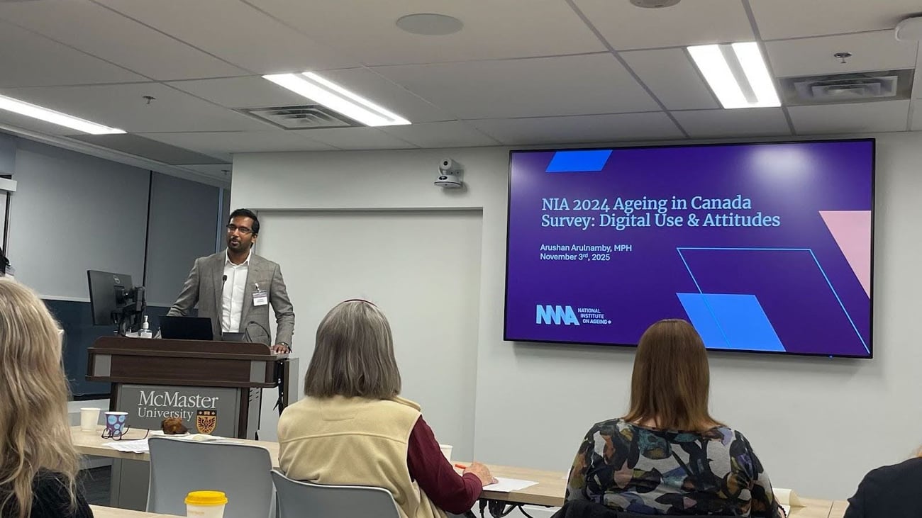 At a national town hall hosted by the McMaster Institute for Research on Aging and EMPOWrD, Policy Analyst, Arushan Arulnamby, shared early findings from the 2024 Ageing in Canada Survey, including data on smartphone use, virtual care and digital tool adoption among older adults. These insights help inform innovation and policy to support digital inclusion.