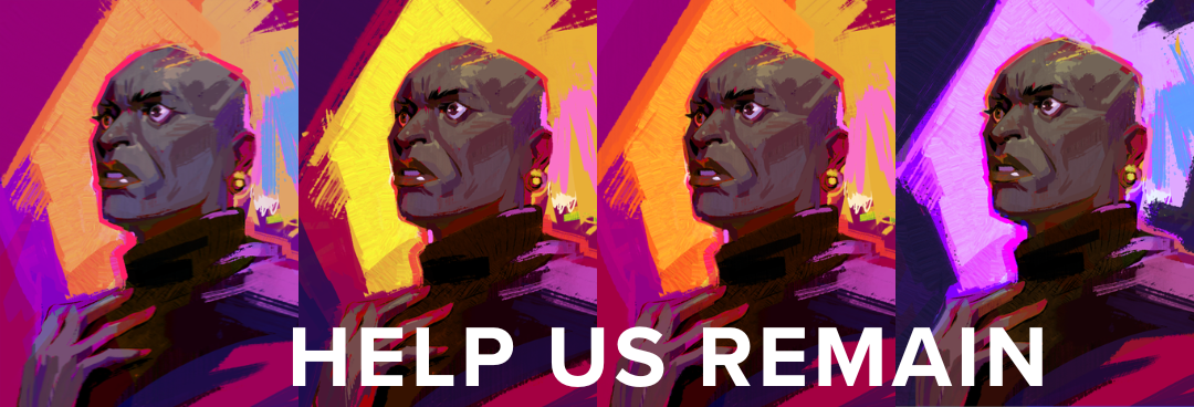 Digital art featuring four identical, expressive portraits of a person with dark skin, bald head, and hand on chest, evoking shock, fear, grief, and quiet devastation, against a backdrop of vibrant, abstract purple, yellow, and red shapes, with the text 'HELP US REMAIN' above